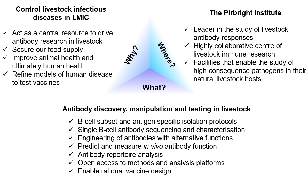 This highly collaborative work will address the needs of the livestock research community whilst bridging the requirements of the vaccine industry. A number of work programmes will focus on studying B cells and antibodies at multiple scales including gene expression, single cell function and the entire antibody response.